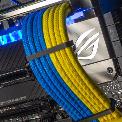 Our design team planned a dual-loop watercooled gaming PC with Oleksandr’s logo lasercut and backlit into a custom-made backplate and the entire system finished in the Ukranian national colours, highlighted by a mirror in the floor of the case.
