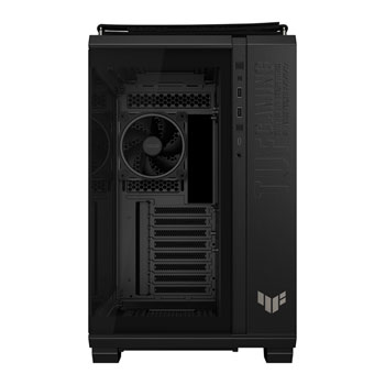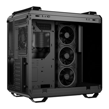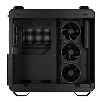 BOUNDLESS PANORAMIC VIEW The TUF Gaming GT502 Horizon ARGB case features a panoramic design with a seamless view, unhindered by a front pillar. It has a dual-chamber chassis for independent cooling zones and comes with four pre-installed ARGB fans. The case also includes tool-free side panels, a front-panel USB Type-C port, and TUF Gaming-style woven straps. Its fully modular design allows for easy hardware installation and customisation.