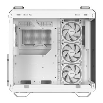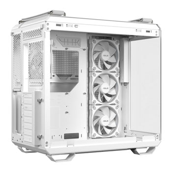 BOUNDLESS PANORAMIC VIEW The TUF Gaming GT502 Horizon ARGB case features a panoramic design with a seamless view, unhindered by a front pillar. It has a dual-chamber chassis for independent cooling zones and comes with four pre-installed ARGB fans. The case also includes tool-free side panels, a front-panel USB Type-C port, and TUF Gaming-style woven straps. Its fully modular design allows for easy hardware installation and customisation.