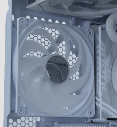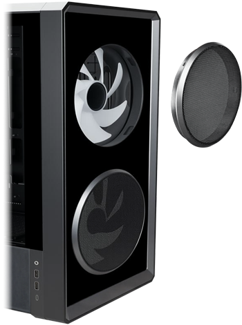 Ready for AirflowBehind the mirrored façade sit detachable front grates positioned over the intake fans. Their geometric pattern adds texture and rhythm to the panel while quietly serving airflow. Combined with side cut-outs and open channels, they let the system breathe freely without breaking the illusion of solid glass.