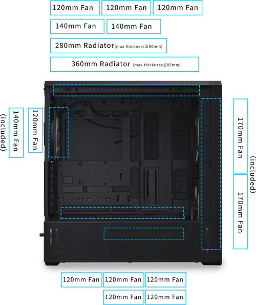 Comprehensive Cooling SupportThe LANCOOL 217 INF offers excellent compatibility. In addition to the included 170 mm and 140 mm fans, it supports multiple additional fans and accommodates up to a 360 mm radiator with a total thickness under 85 mm.