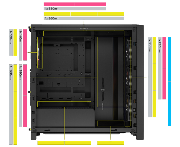 DUAL 360mm RADIATOR SUPPORTBoost your cooling with three dedicated mounting locations for 360mm radiators - front, roof, and side. You can mount up to 10x 120mm fans simultaneously, ensuring continuous cool air intake and efficient hot air exhaust.