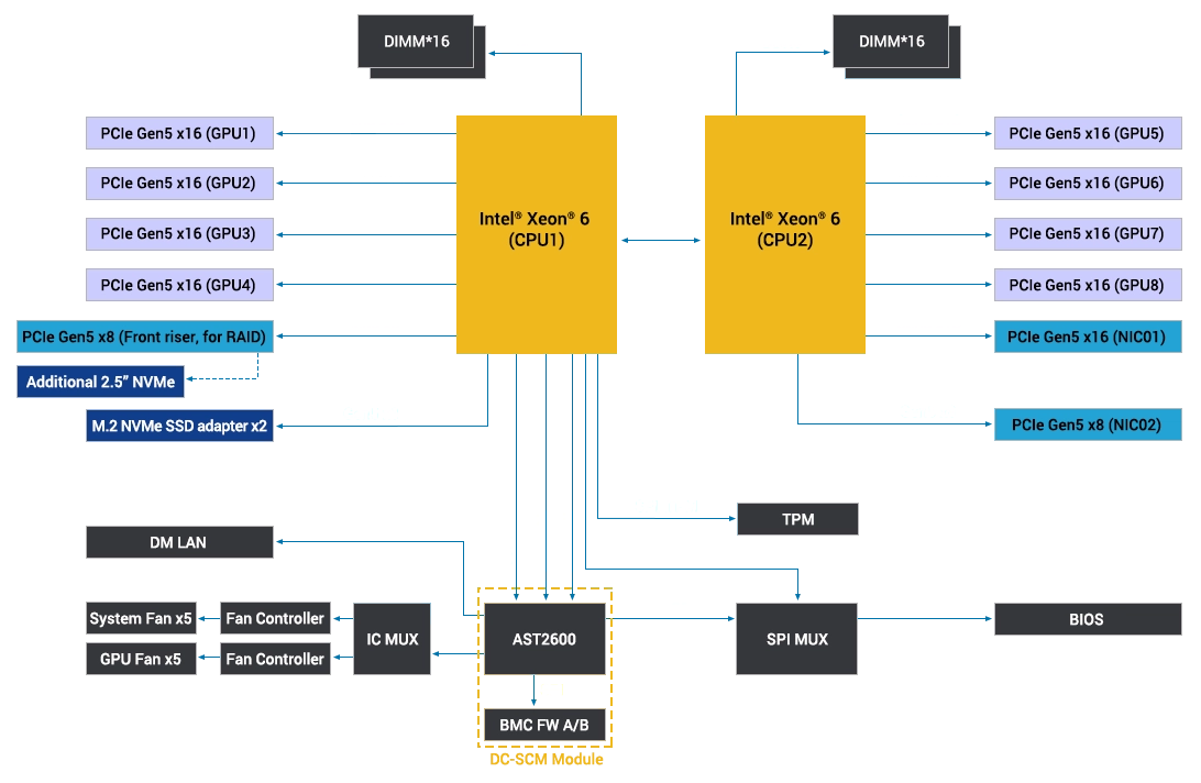 Secondly a 4U chassis with up to eight GPUs powered by a pair of Intel Xeon 6 CPUs with up to 160-cores, and up to 4TB of RAM.