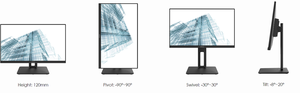 Adjust the MSI PRO series monitors' screen easily to provide you the most comfortabe viewing angle for your working position. Tilt your monitor up or down to face you according to your viewing height or use pivot function of supporting models to get the familiar paper view for your text editing needs.