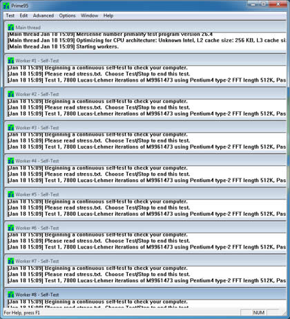 Prime95 is deployed to provide a heavy workload for both the CPU's multiple cores and the system memory, whilst CPU-Z illustrates and confirms processor operating speed. RealTemp, an optional nicety, can be used to closely monitor CPU temperature. At this point, it should keep below 60°C, though the temperature will vary depending on the ambient conditions and the cooling equipment used.
