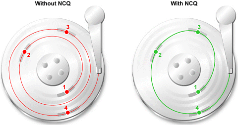 NCQ is one of the capabilities which can be included in SATA drives. It allows a queue of requests to be organised to allow data transactions to occur more efficiently, rather than dealing with each request one at a time. NCQ is shown below, the image courtesy of www.nvidia.com. It is clear from the diagram that a drive with NCQ enabled is much more efficient at accessing data than a drive without the technology.